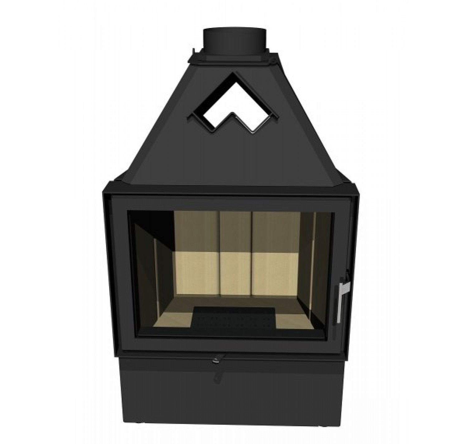 Корпус каминной топки выполнен из жаропрочной стали, колосники и патрубки из чугуна.